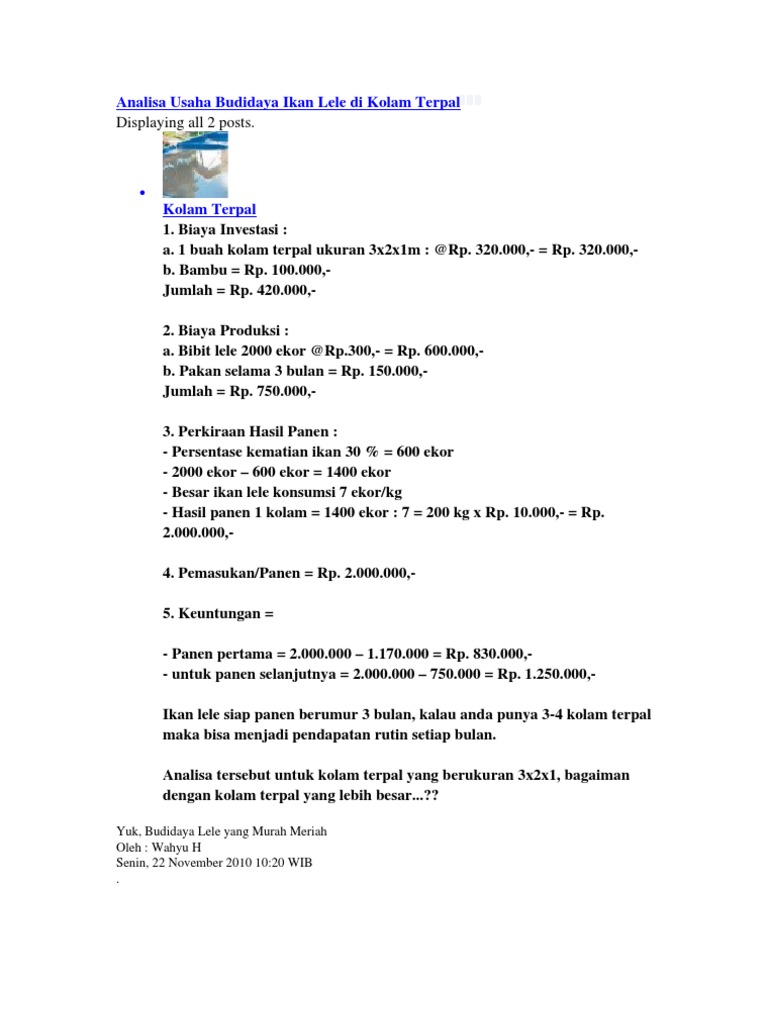Analisa Usaha Budidaya Ikan Lele Di Kolam Terpal