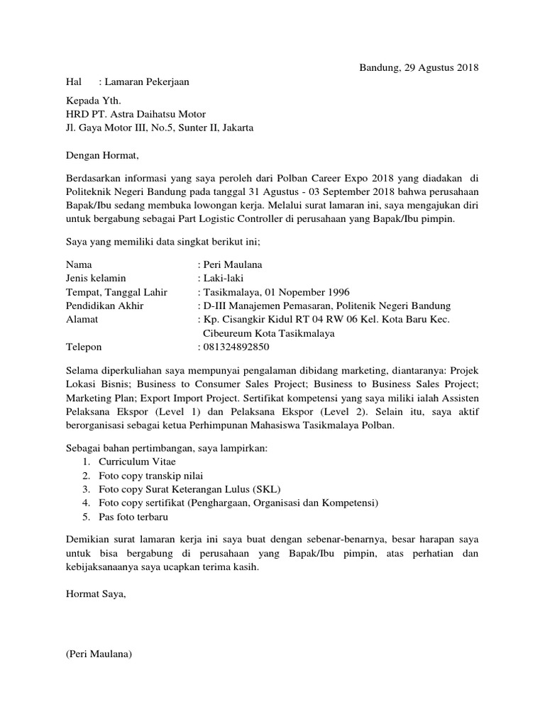 Contoh Surat Lamaran Kerja Pt Astra Daihatsu