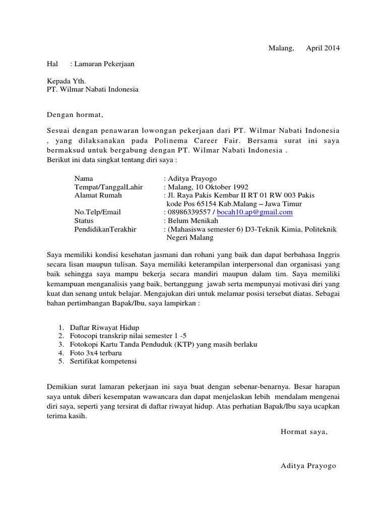 Contoh Surat Lamaran Kerja Pt Wilmar