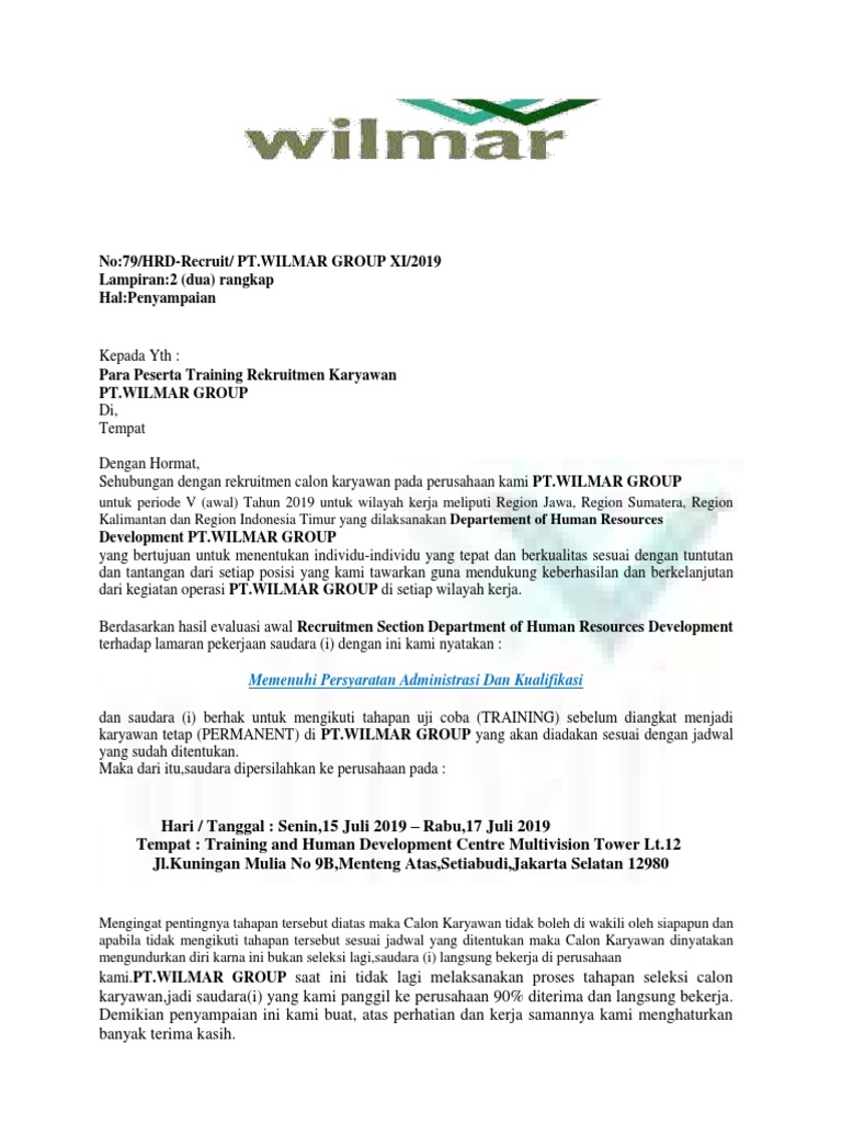 Surat Panggilan Trainning Karyawan Pt.wilmar International Group