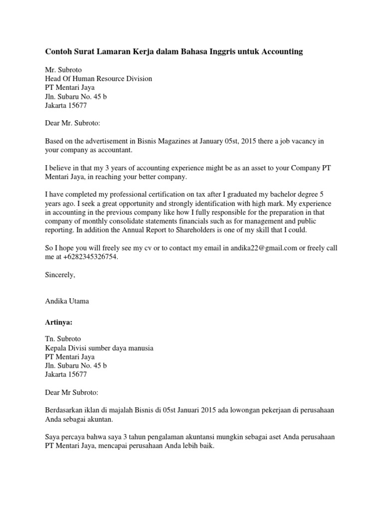Contoh Surat Lamaran Pekerjaan Dalam Bahasa Inggris Dan Artinya