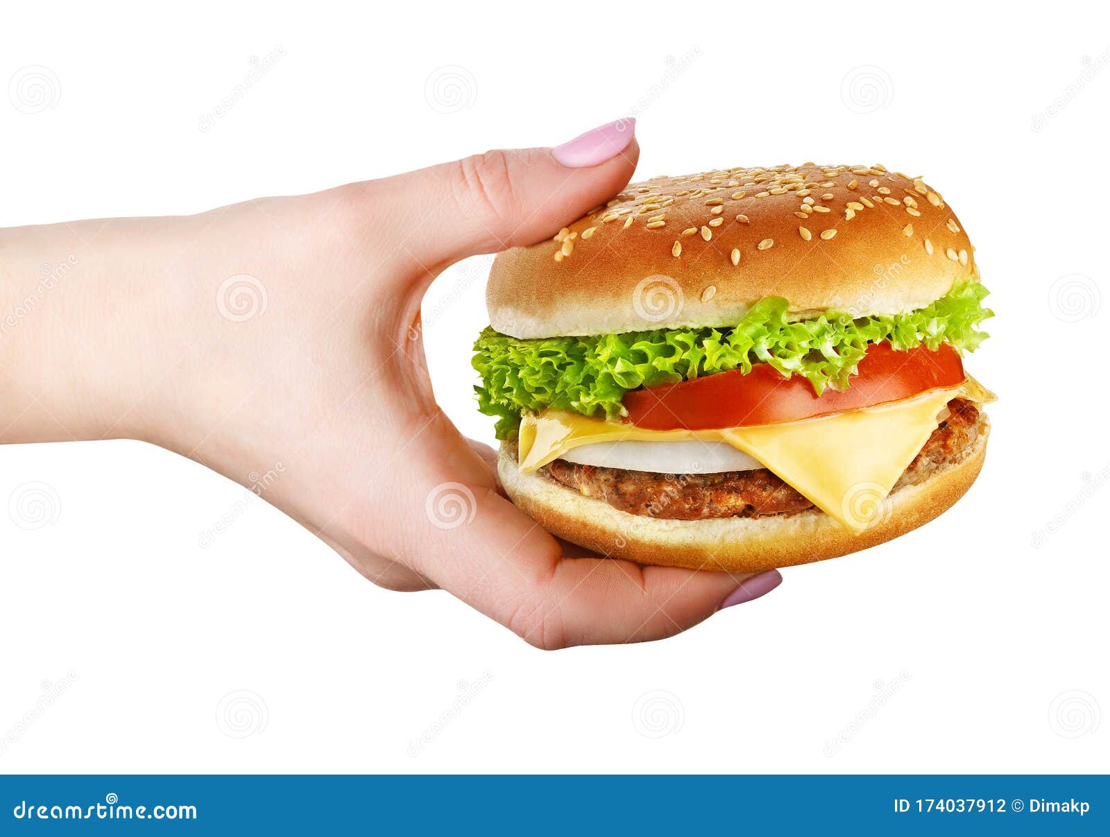 Burger In Hand Isolated On White Background Stock Photo - Image of snack, hamburger: 174037912