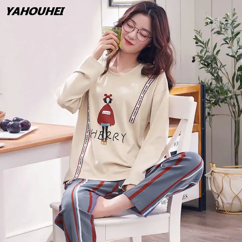 2019 Baru Autumnbrand Wanita Piyama Set Hewan Gambar Kartun Ukuran Besar Perempuan Baju Tidur Wanita Pijamas Sesuai dengan Rumah Pakaian Piyama Femme| | - AliExpress