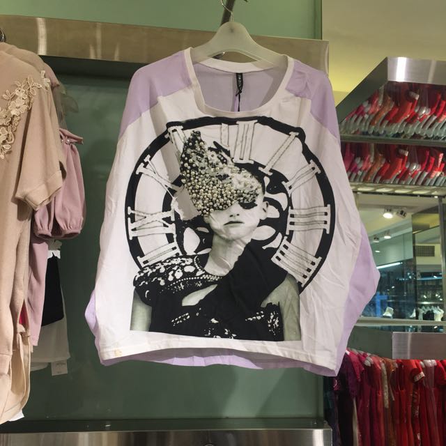 Baju kaos gambar orang warna putih ungu, Fesyen Wanita, Pakaian Wanita, Atasan di Carousell