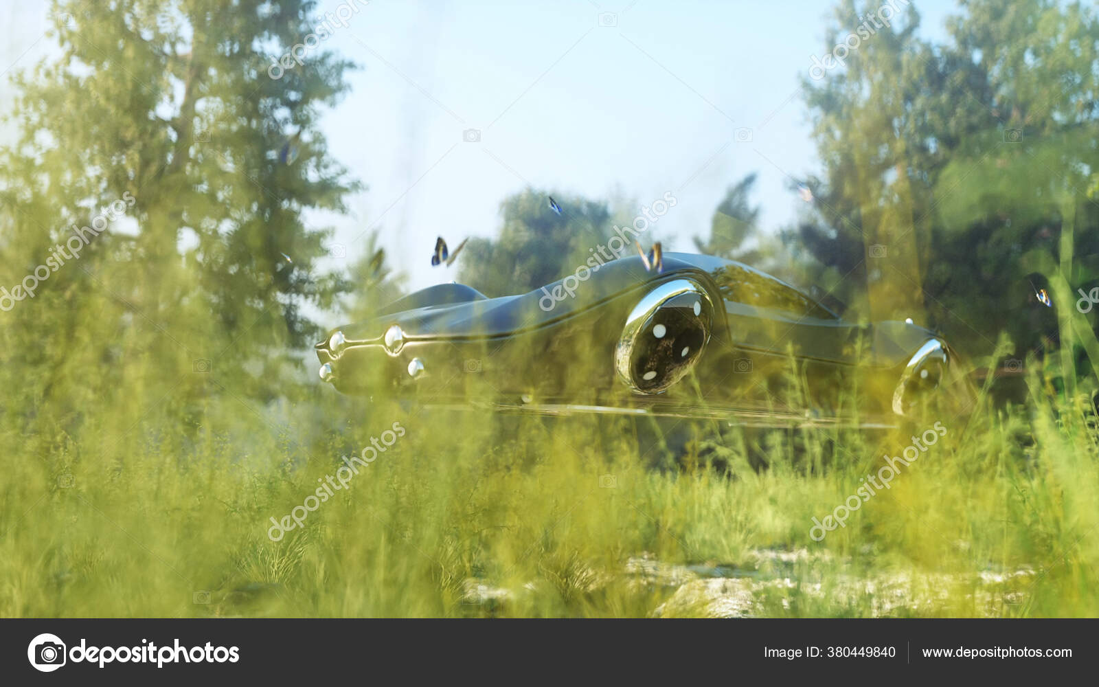 Mobil terbang Futuristik di hutan. Konsep masa depan. Rendering 3d. — Stok Foto © chagpg #380449840