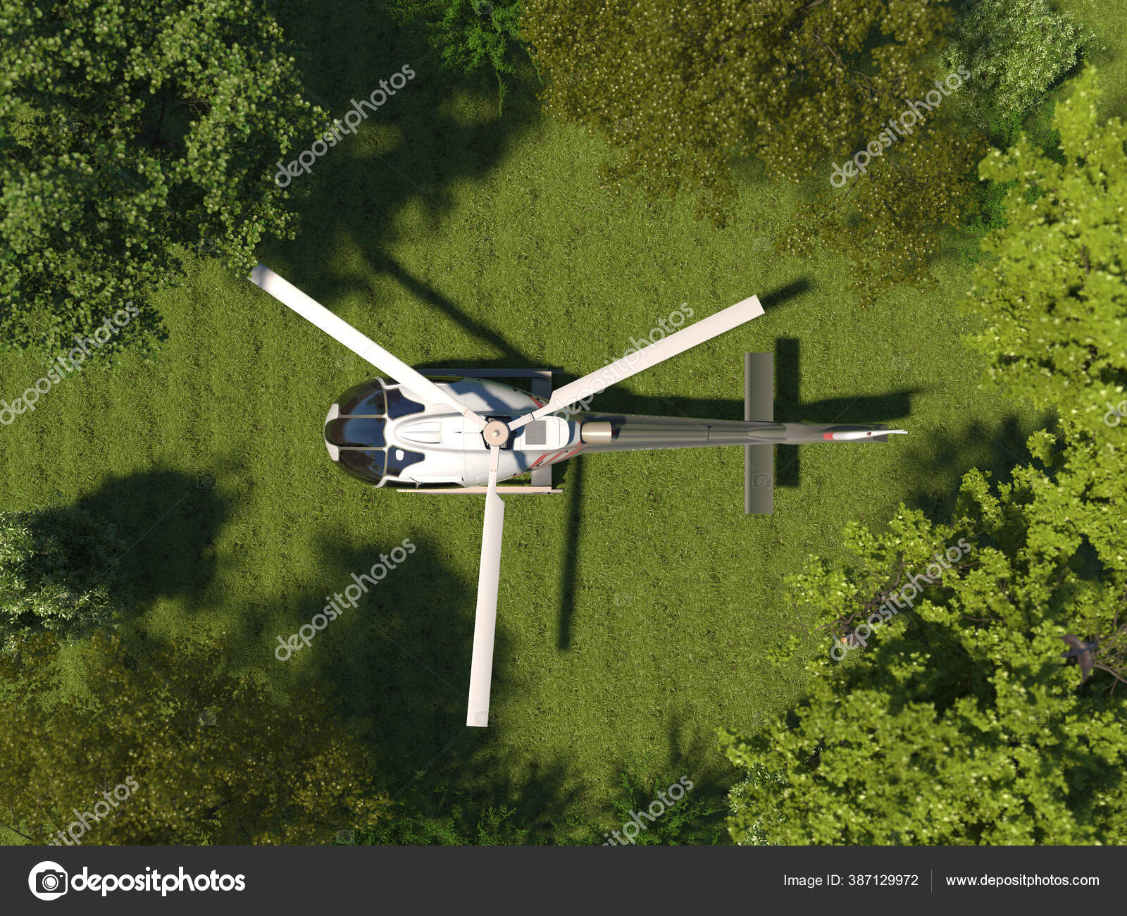 Sebuah Helikopter Berdiri Atas Rumput Dalam Pandangan Atas Helipad Hutan — Stok Foto © Jud_g #387129972