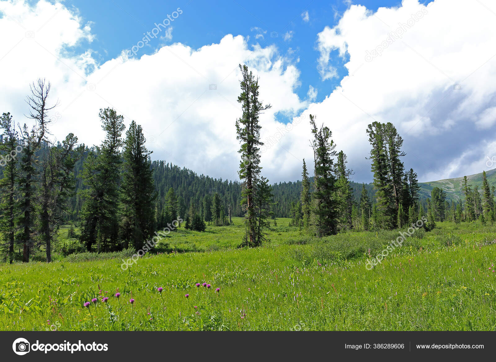 Rumput Hijau Padang Rumput Dengan Pohon Cemara Pegunungan Taiga Pemandangan — Stok Foto © Al.geba #386289606