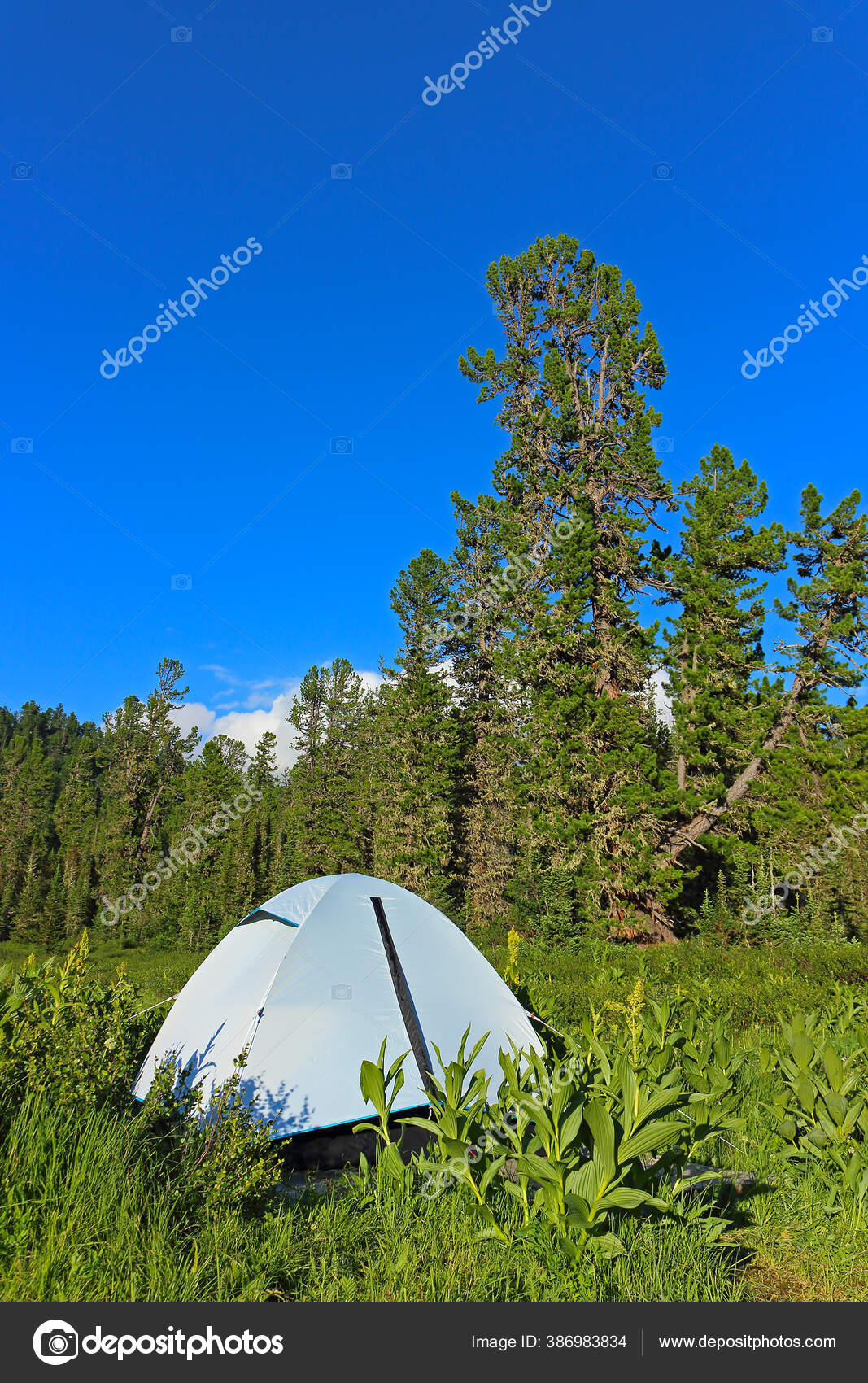 Tenda Putih Padang Rumput Musim Panas Hutan Konifer Campaign Taiga — Stok Foto © Al.geba #386983834
