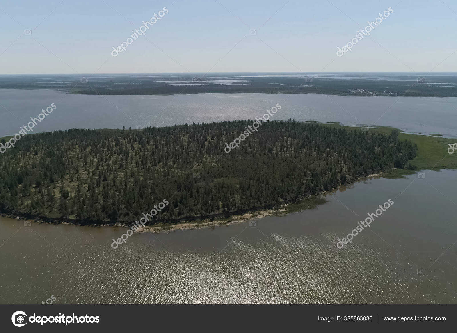 Lihat Dari Atas Tundra Hutan Pantai Sungai Dan Pulau Dengan — Stok Foto © 001chock #385863036