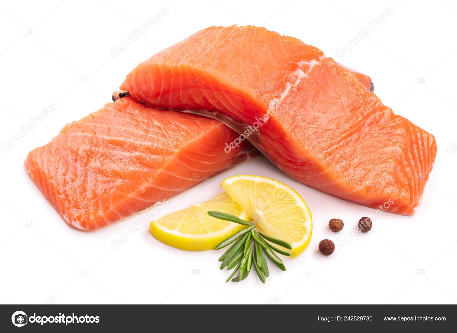 Fillet ikan merah salmon dengan lemon dan rosemary terisolasi pada latar belakang putih — Stok Foto © kolesnikovserg #242529730