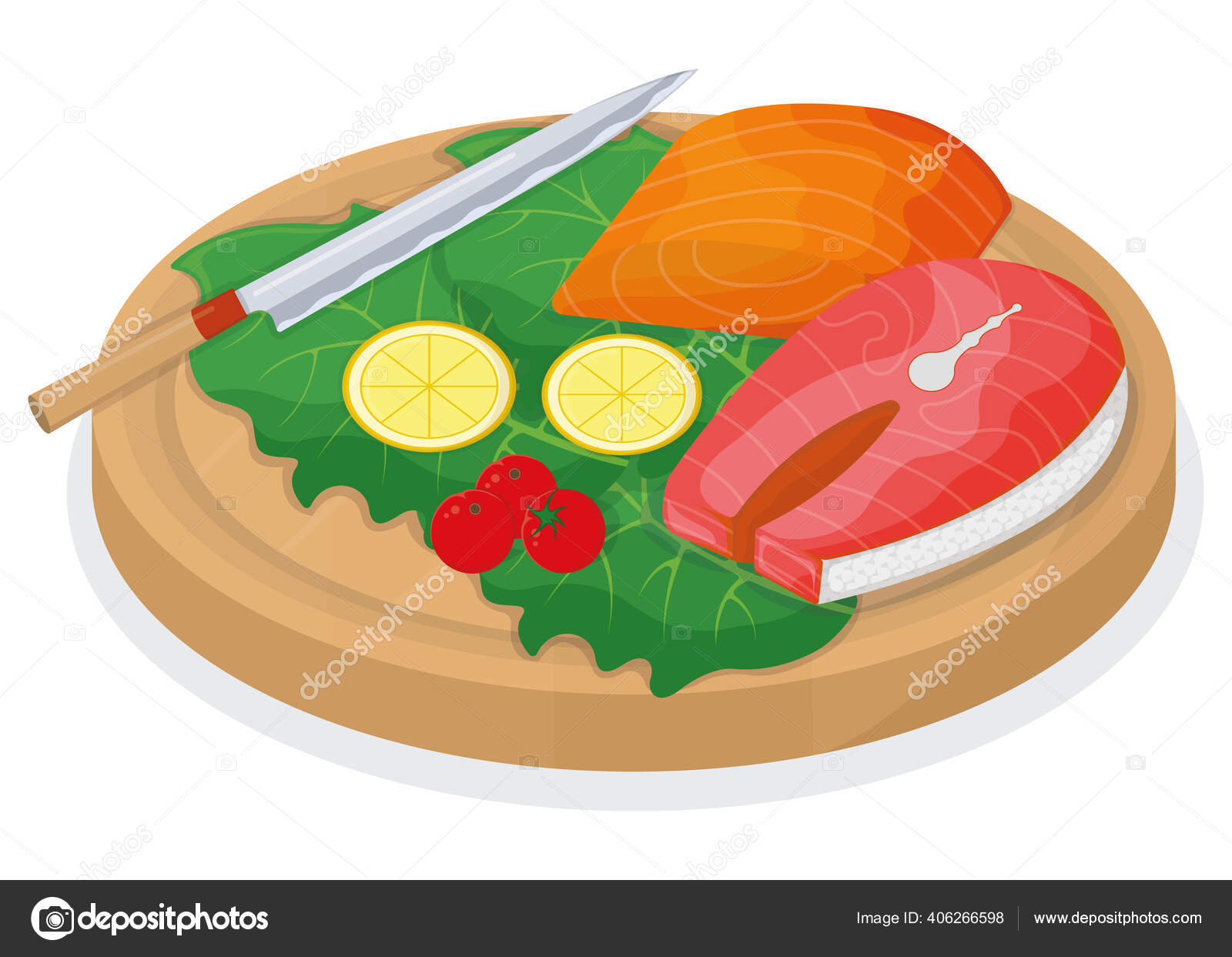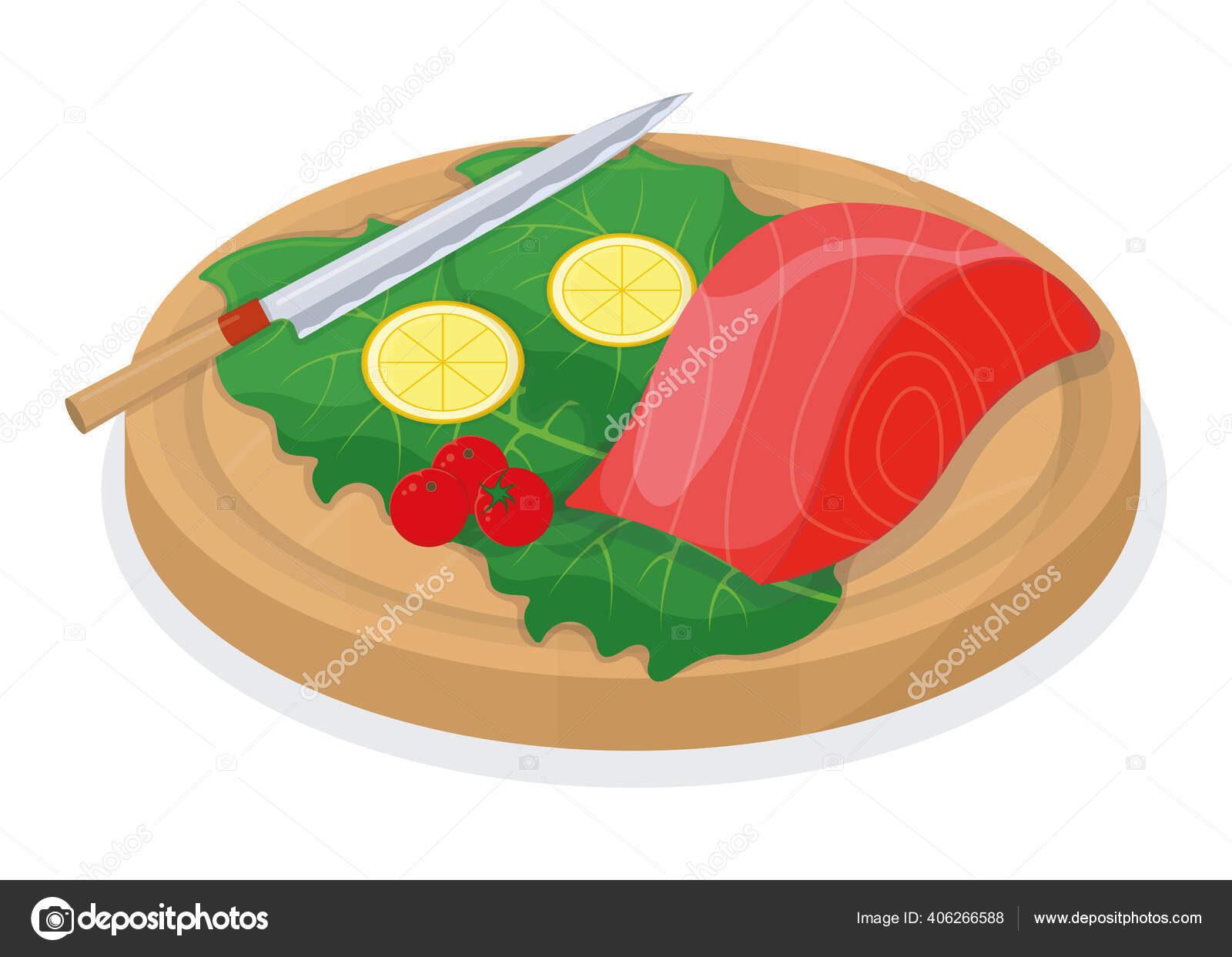 Potong Ikan Tuna Dan Ikan Salmon Pada Papan Dapur Kayu — Stok Vektor © apvaper #406266588