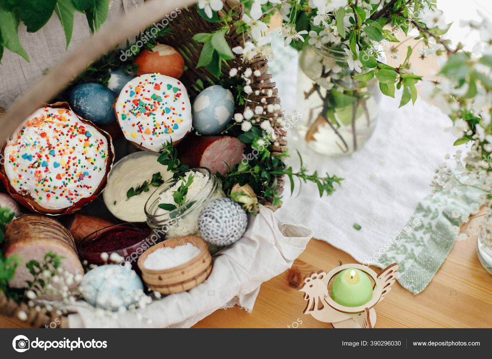 Keranjang Paskah Tradisional Untuk Berkah Gereja Telur Modern Paskah Kue — Stok Foto © Sonyachny #390296030