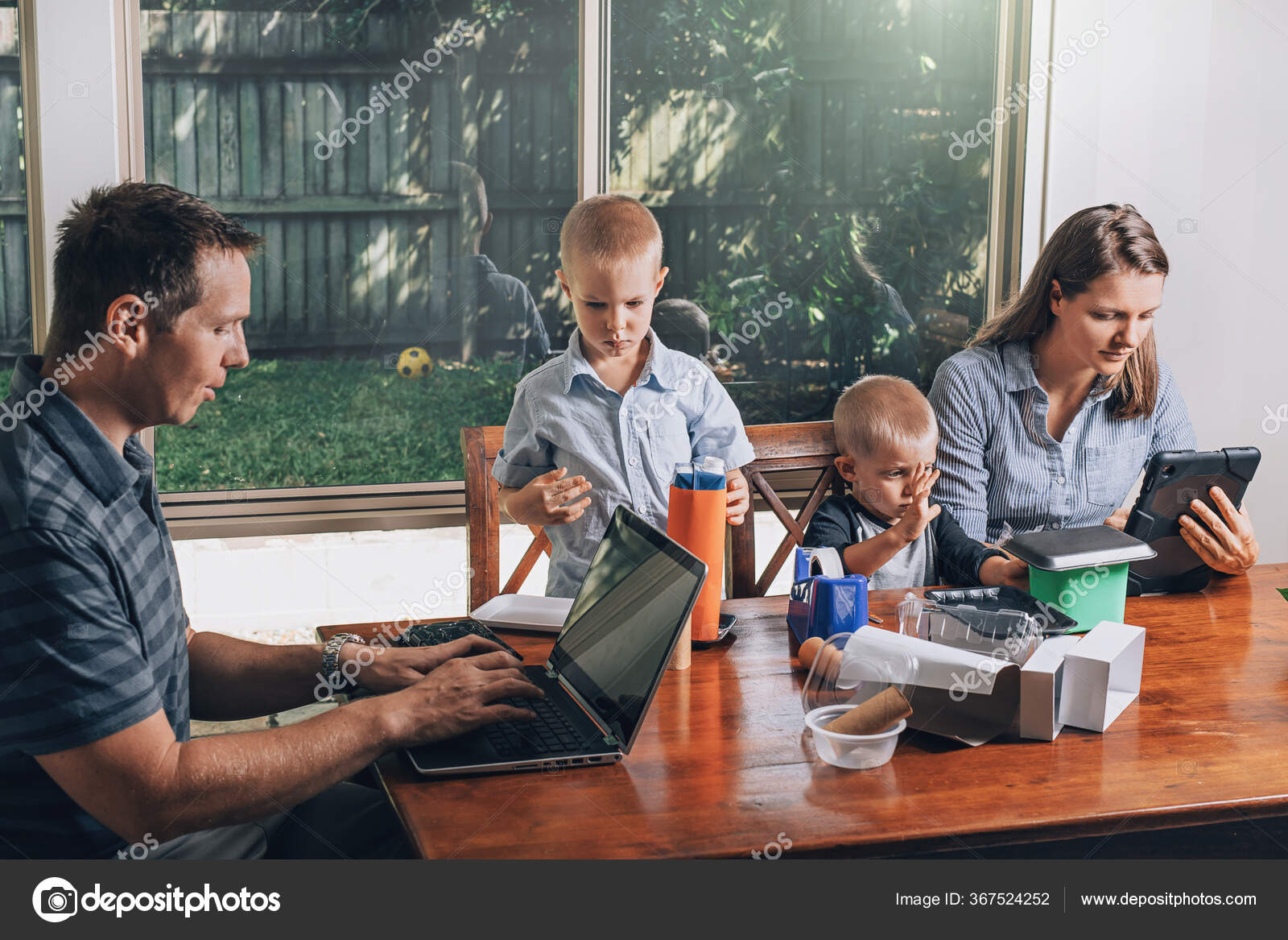 Konsep pekerjaan dari rumah dan rumah pendidikan keluarga. Orang tua dan dua anak laki-laki duduk di meja. — Stok Foto © dfd.maro@gmail.com #367524252