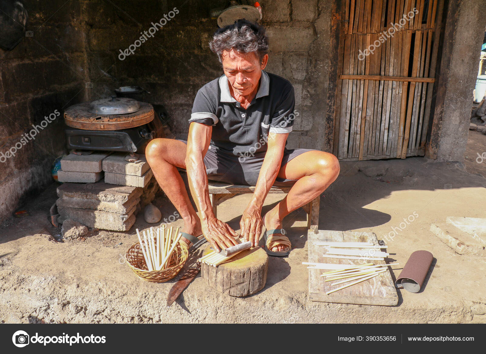 Orang tua bekerja dengan bambu di bengkelnya untuk membuat sedotan bambu, Bali, Indonesia. Cara ekologis untuk menghasilkan produk daur ulang. Tampilan depan untuk pekerja yang membuat sedotan bambu — Stok Foto ©