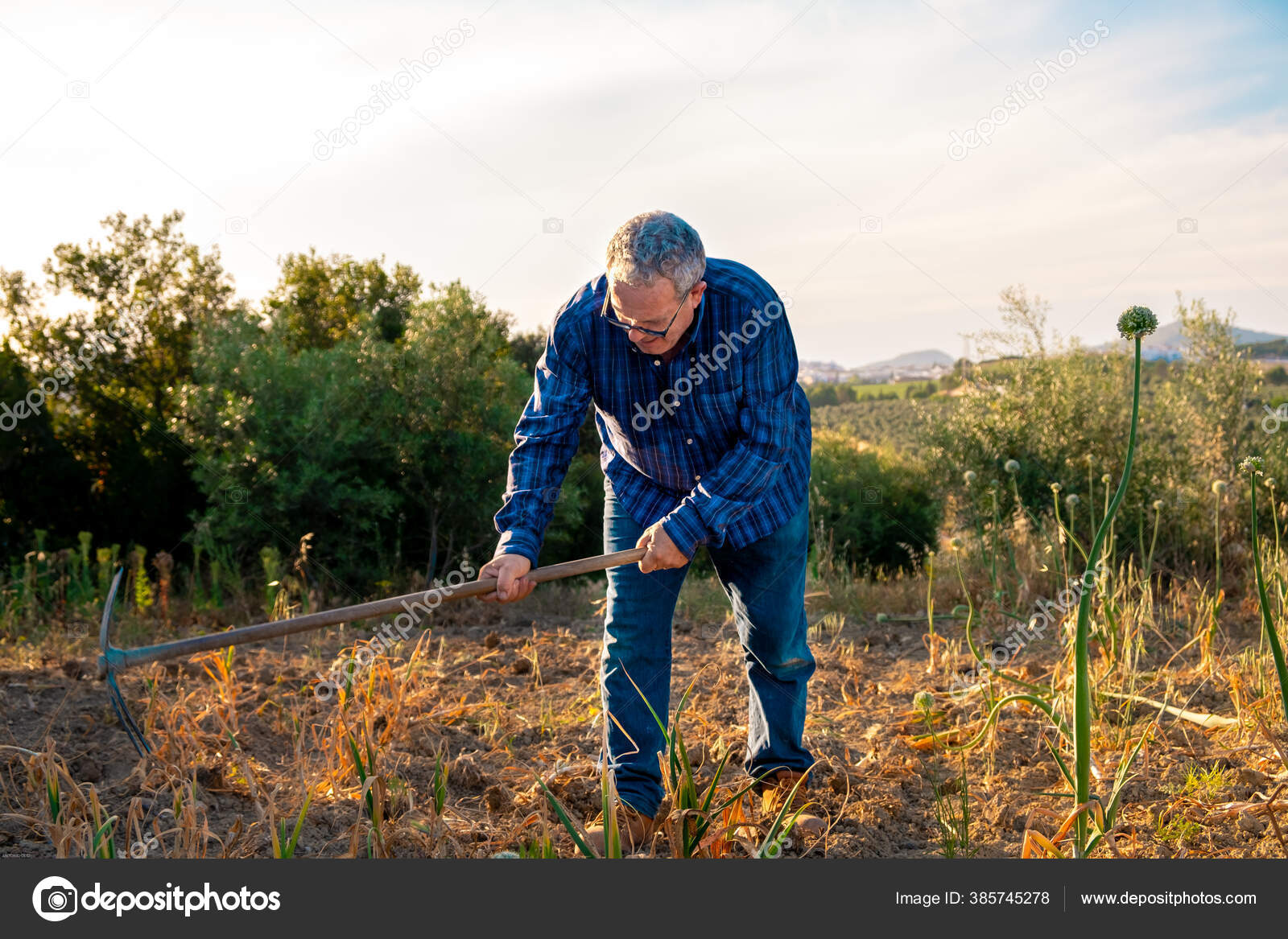 Orang Tua Dengan Kemeja Kotak Kotak Biru Dan Jeans Mengolah — Stok Foto © tkkidolvera #385745278