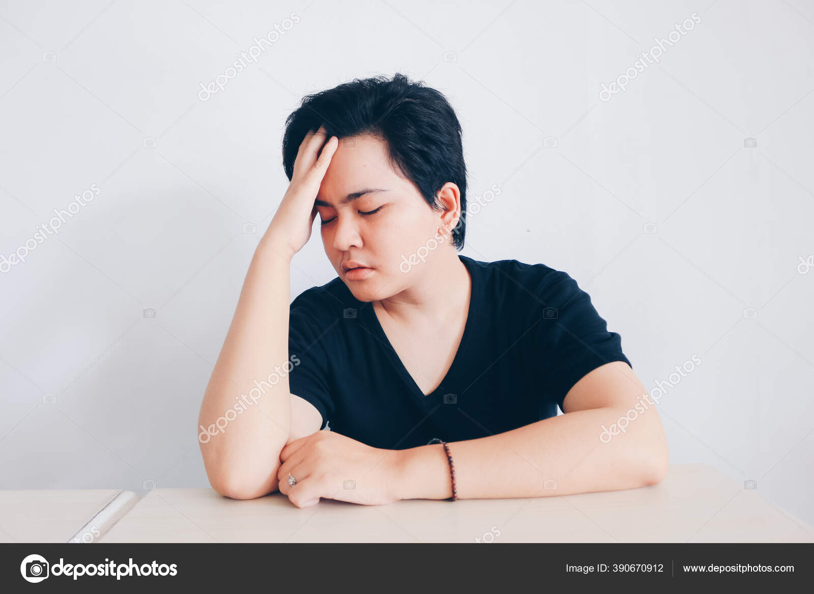 Wanita Asia Berambut Pendek Kemeja Hitam Menyentuh Kepalanya Stres Dan — Stok Foto © Reezky11 #390670912