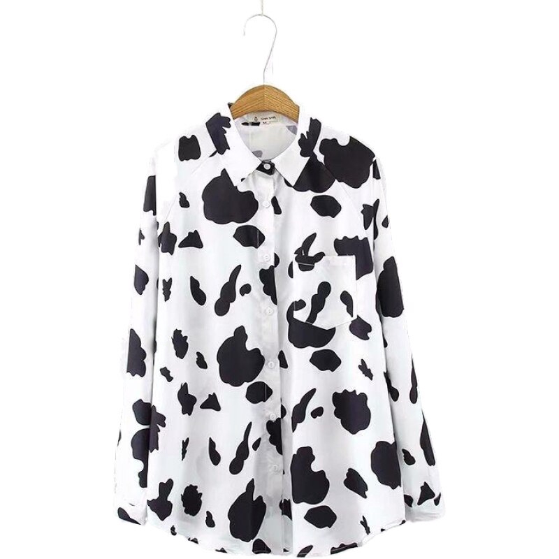 Kemeja Lengan Panjang Bahan Sifon Warna Putih Motif Print Kartun Sapi Untuk Wanita | Shopee Indonesia