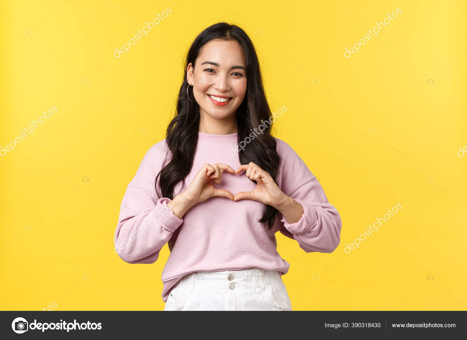 Gaya hidup, emosi dan konsep iklan. Indah dan peduli, ramah-cari gadis korea tersenyum lebar, menunjukkan tanda hati di atas dada dan berdiri latar belakang kuning — Stok Foto © benzoix #390318430