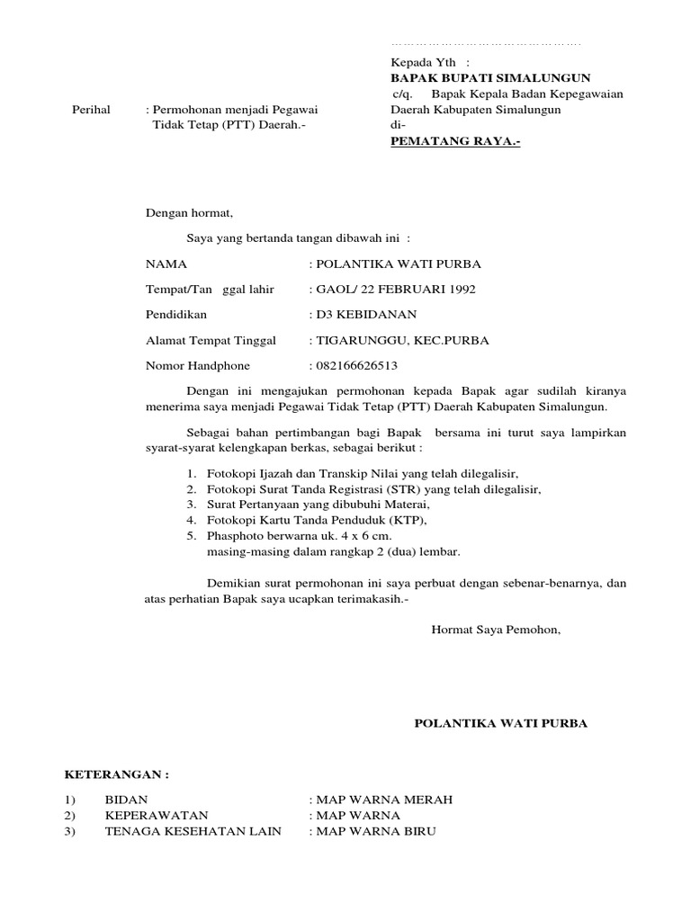 Contoh Surat Lamaran Kerja Bidan Ptt Pusat Backup Gambar