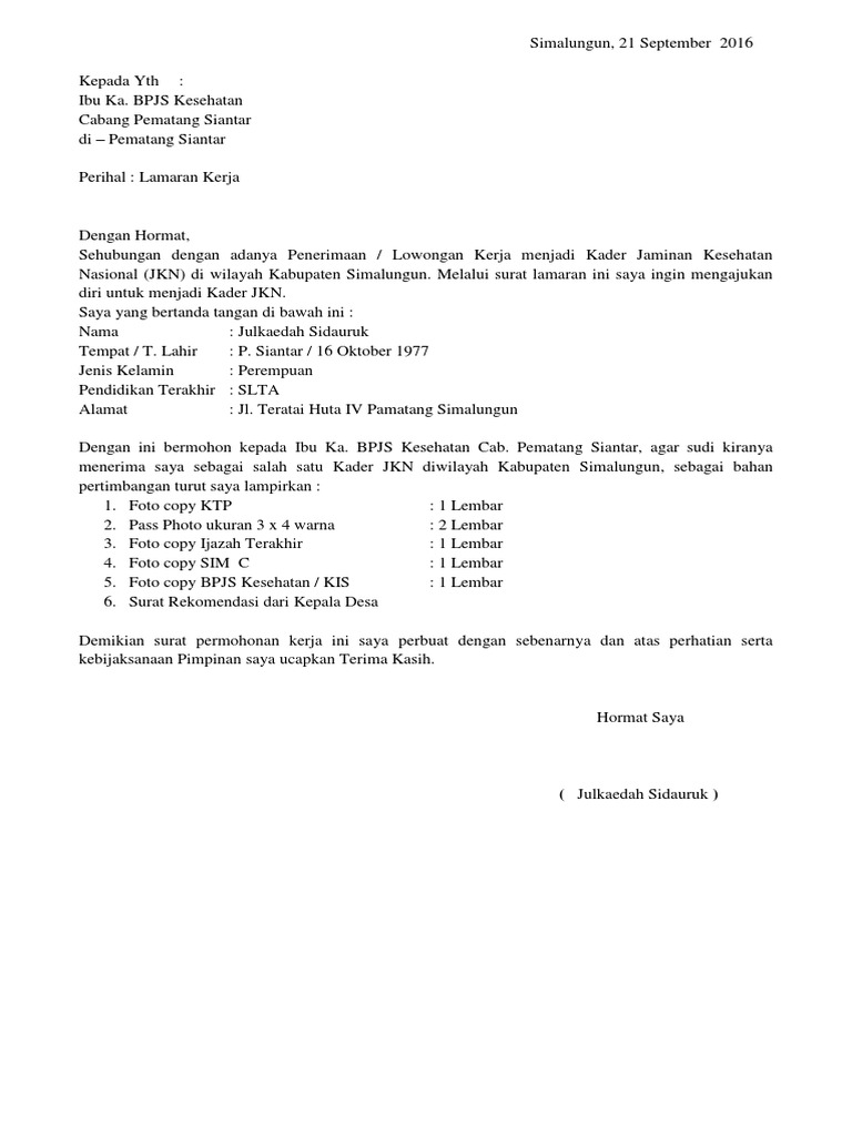 contoh surat lamaran kerja bpjs kesehatan ptt - Gawe CV
