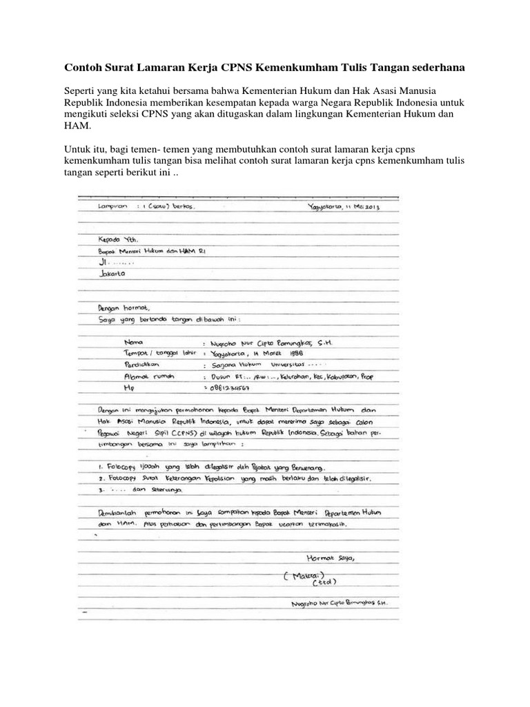 Contoh Surat Lamaran Kerja CPNS Kemenkumham Tulis Tangan sederhana