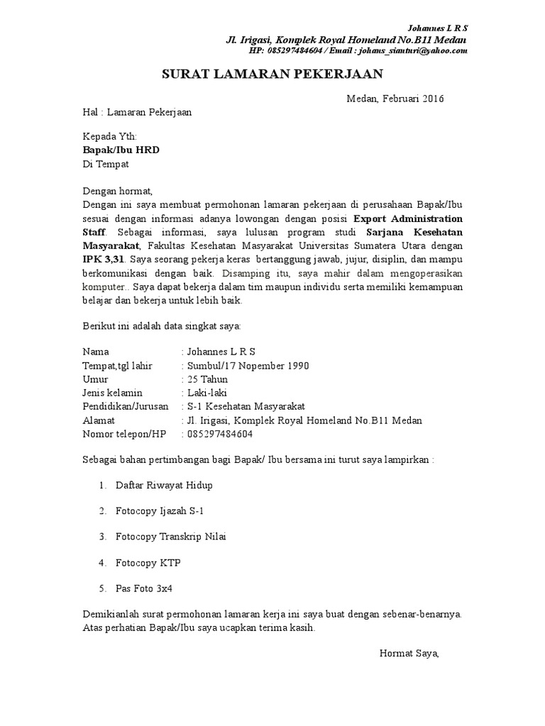 Contoh Surat Lamaran Kerja Kesehatan Masyarakat Di Puskesmas