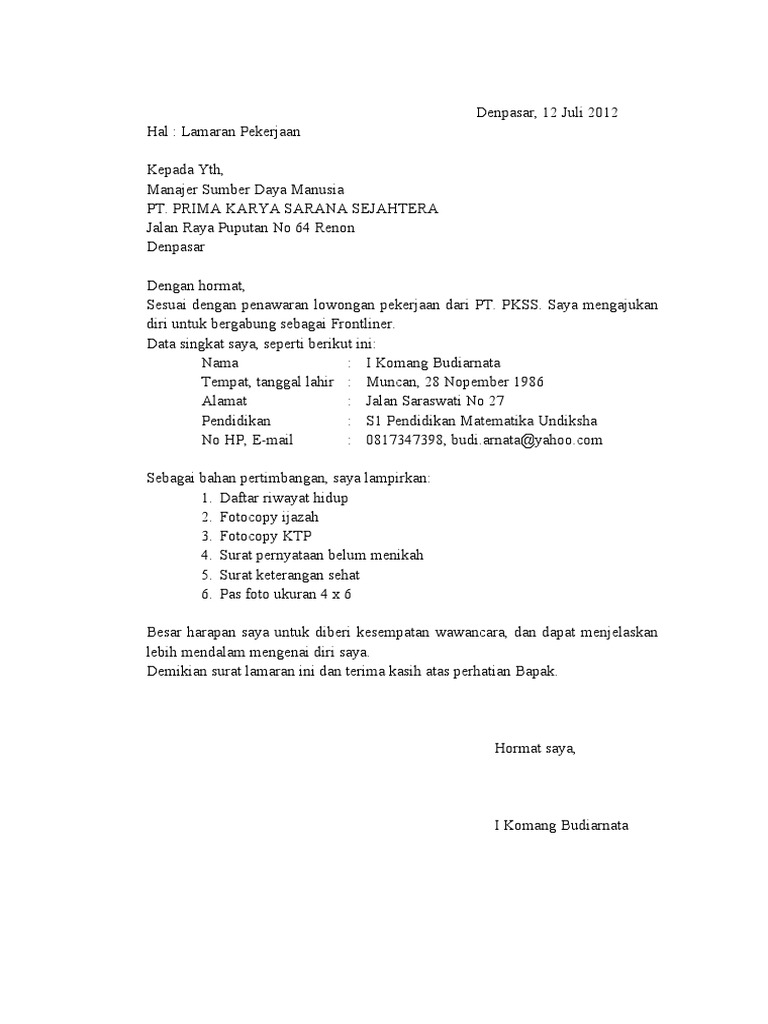 Contoh Surat Lamaran Kerja Di Pt Pkss - Dapatkan Contoh