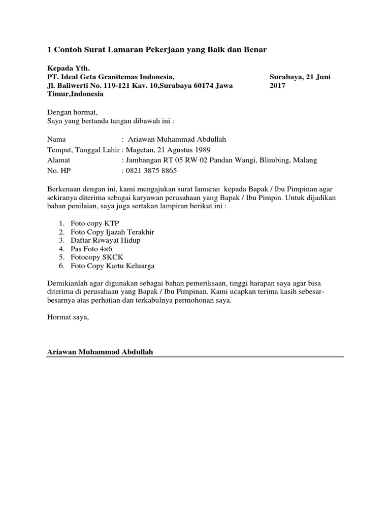 1 Contoh Surat Lamaran Pekerjaan Yang Baik Dan Benar