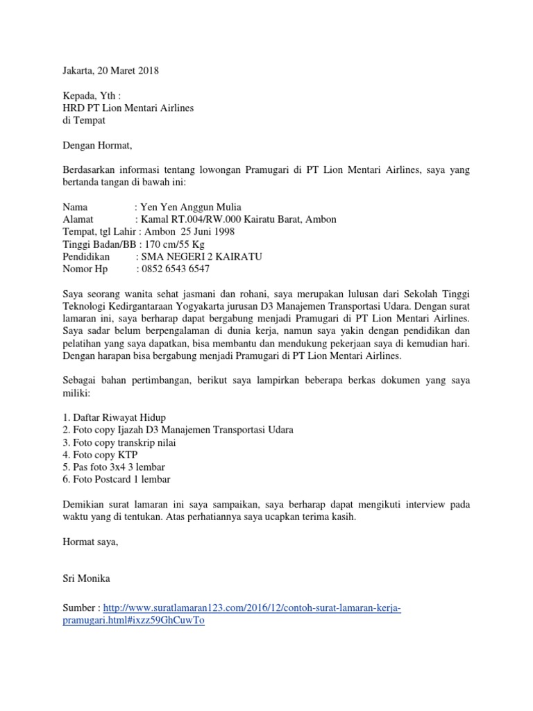 Contoh Surat Lamaran Kerja Menjadi Pramugari Lion Air 2019 - Info Pramugari | Pramugari, Lion, Nama