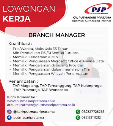 Lowongan Kerja di CV Putmasari Pratama - Penempatan Magelang, Purworejo, Temanggung, Kulonprogo, Wonosobo (Manajer Broadband, Staff Accounting, Team Leader, Telkomsel Sales Agency, Sales Commonity & Corporate) - Portal Info Lowongan Kerja di
