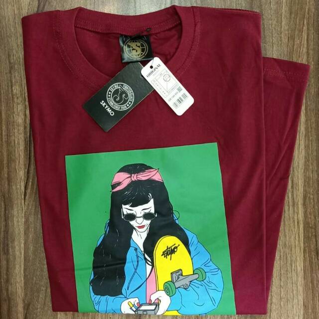 Promo pakaian kaos distro SKYMO atasan baju lengan pendek warna marun gambar cewek kece maen hp | Shopee Indonesia