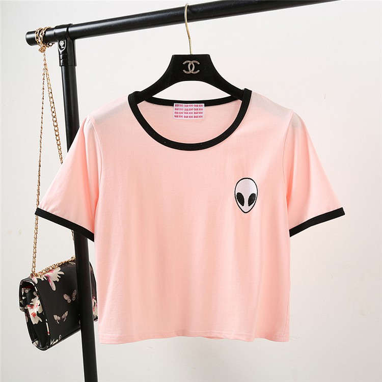 Fashion Wanita: Blus/Kaos T-Shirt Crop Lengan Pendek dengan Gambar Print Alien, untuk Kasual | Shopee Indonesia