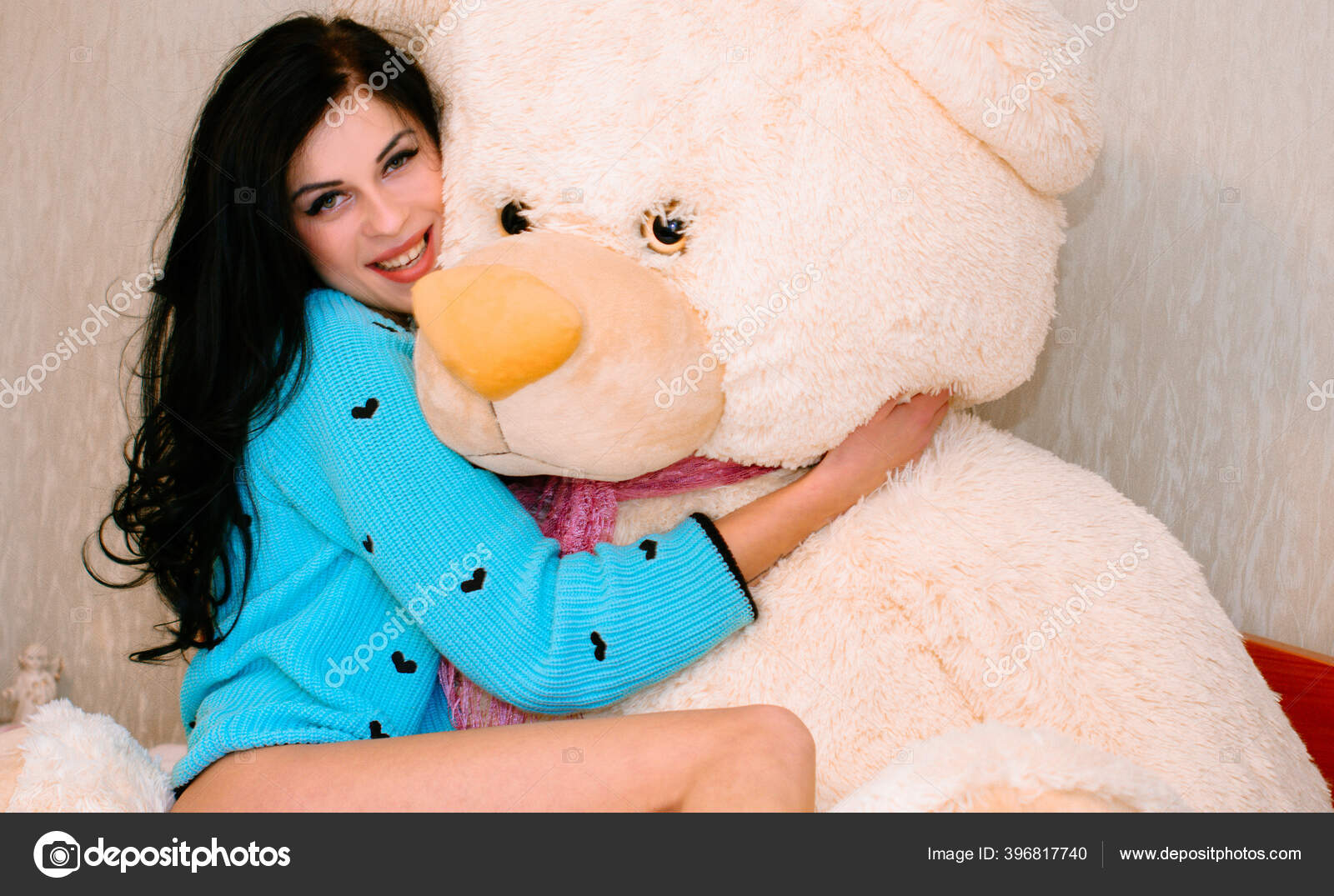 Wanita Cantik Memeluk Boneka Beruang Besar Mainan Lembut Bahagia Tersenyum — Stok Foto © T.DenTeam #396817740