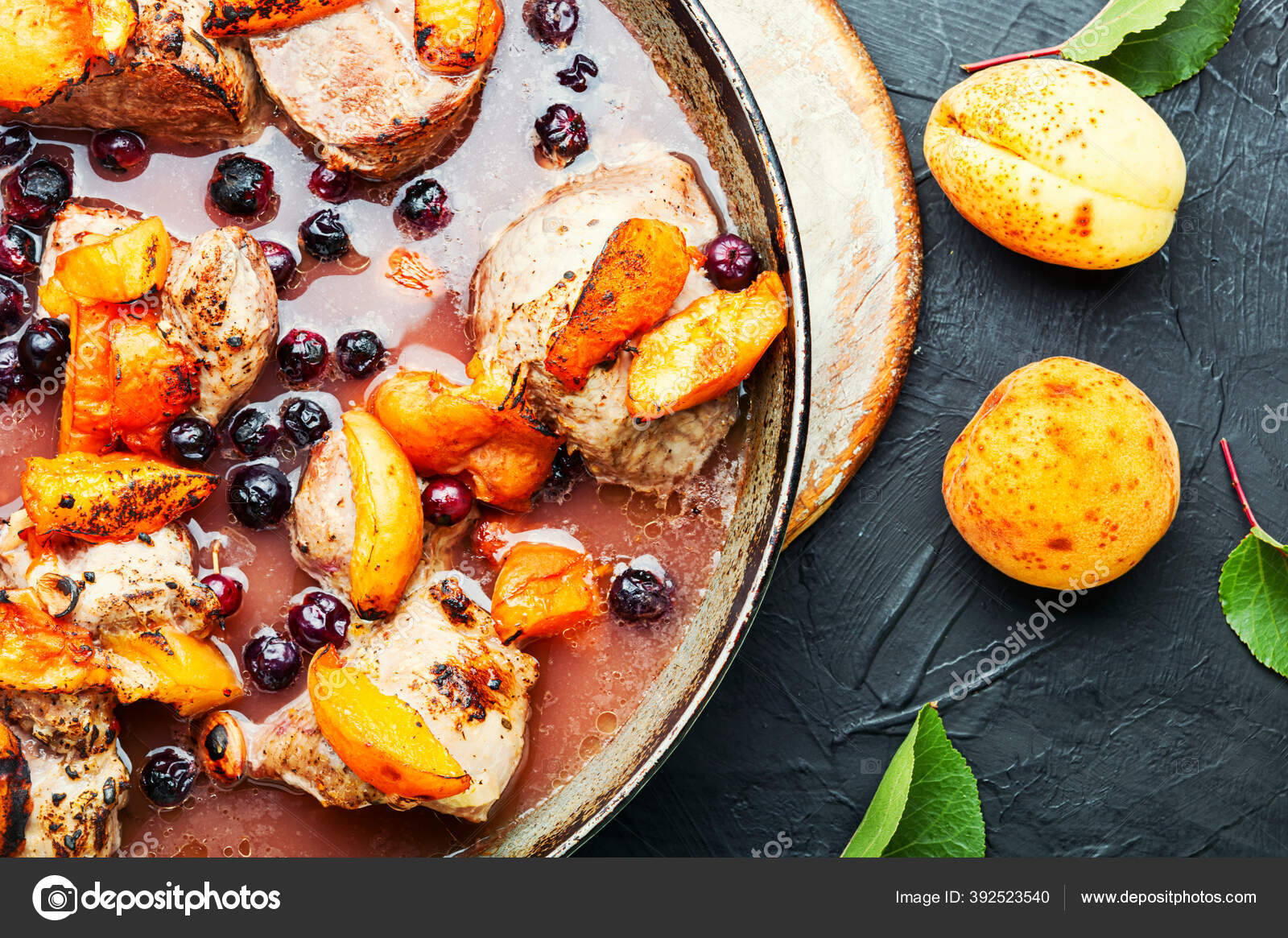 Daging Babi Panggang Dalam Anggur Merah Dengan Aprikot Dan Blackcurrant — Stok Foto © Nikolay_Donetsk #392523540