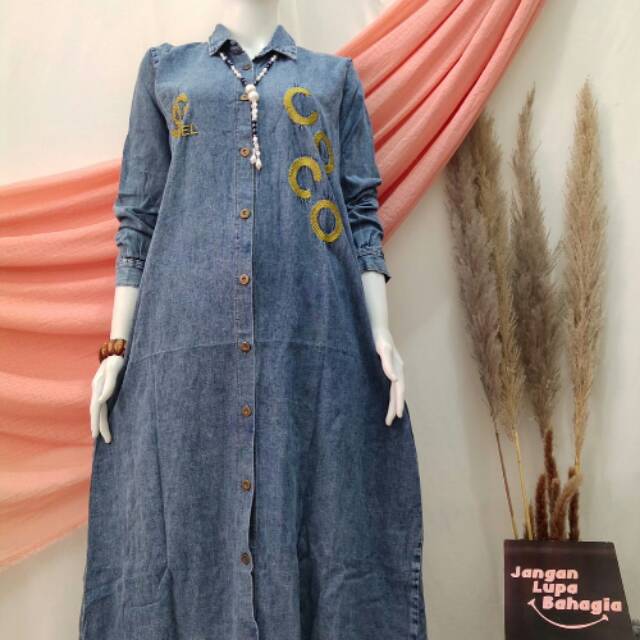 Gamis levis cenel full kancing/gamis jeans | Shopee Indonesia