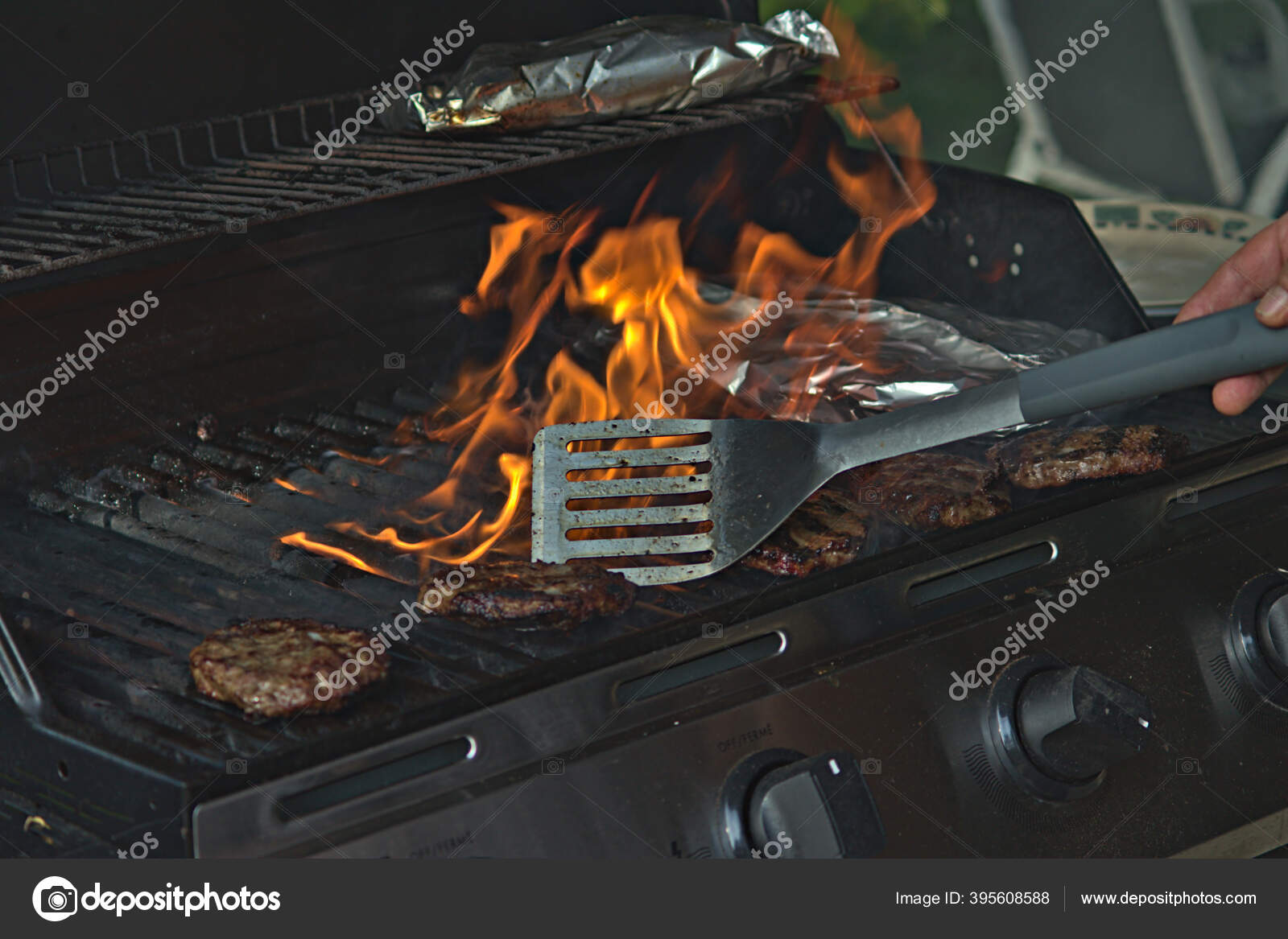 Burger Dan Kentang Dibungkus Kertas Timah Yang Dimasak Pada Barbekyu — Stok Foto © NatureBound #395608588