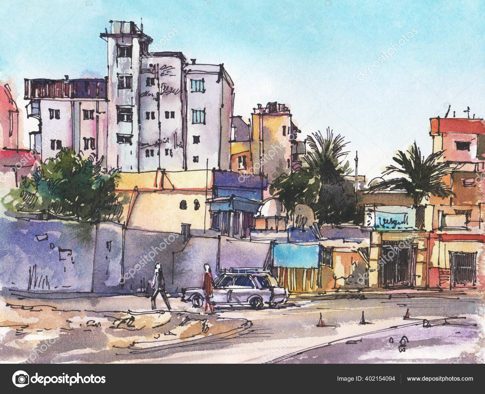 Pemandangan Kota Mesir Sketsa Dengan Cat Air Ilustrasi Gambar Tangan — Stok Foto © tiff20 #402154094