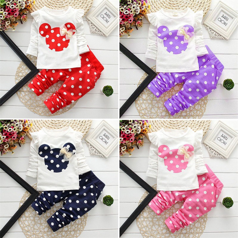 Setelan Kaos T-Shirt Polkadot Anak Perempuan Lengan Panjang Gambar Mickey Mouse + Celana | Shopee Indonesia