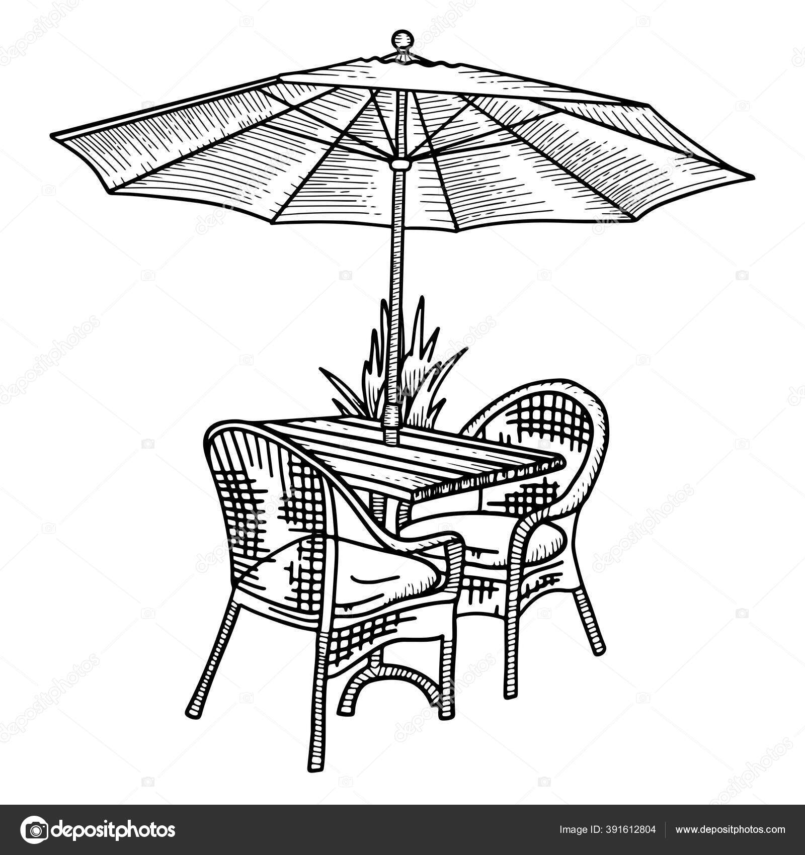 Meja Kayu Dan Dua Kursi Wickerir Bawah Payung Matahari Ilustrasi — Stok Vektor © lanasham #391612804