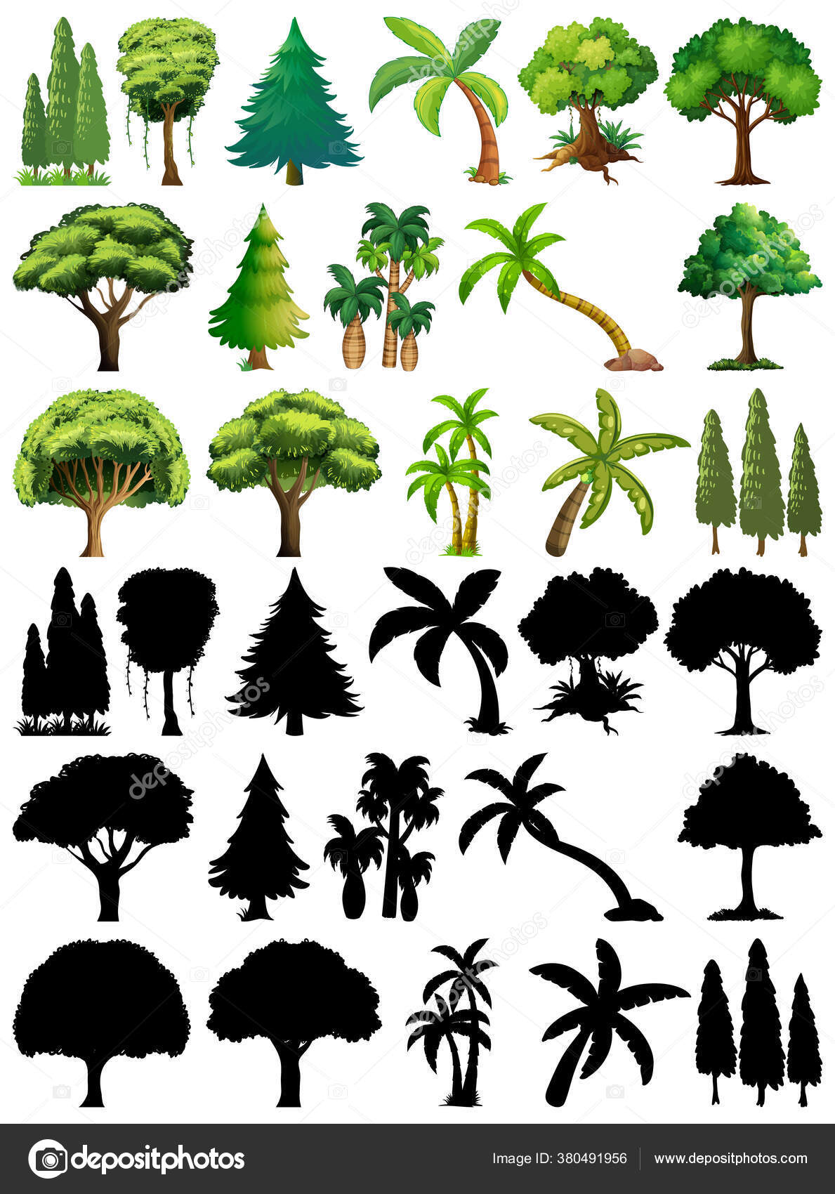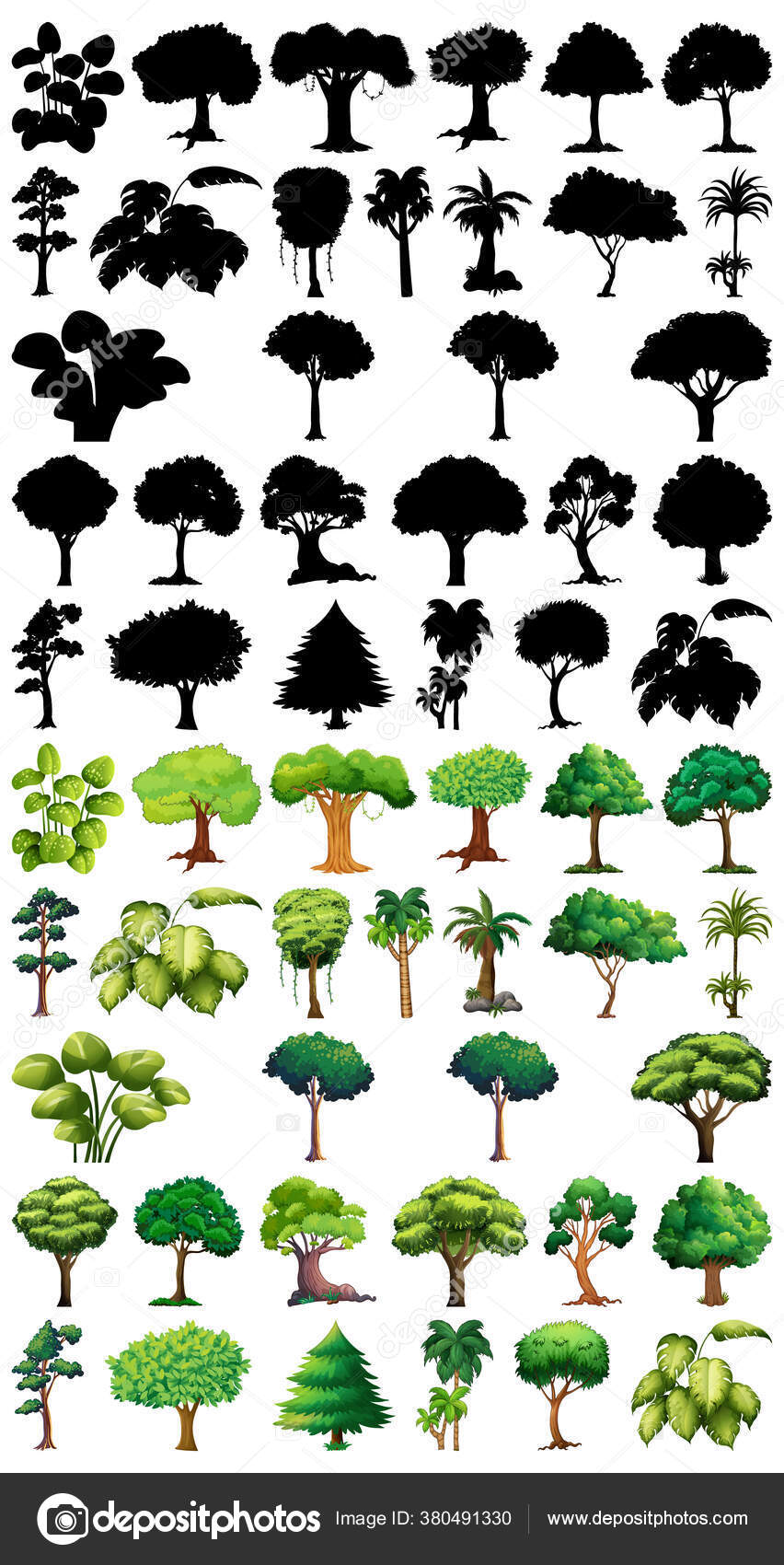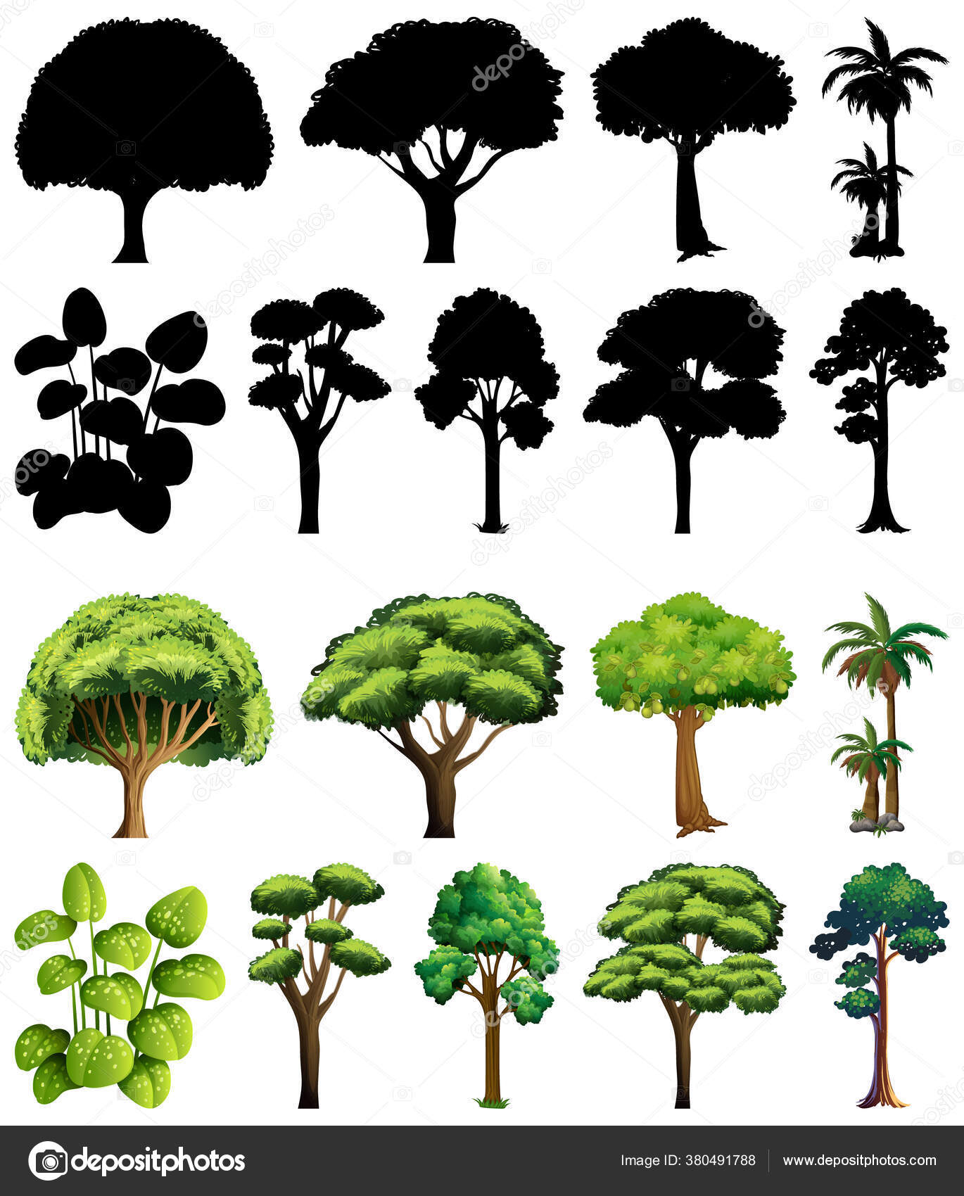 Set Tanaman Dan Pohon Dengan Ilustrasi Siluet Nya Stok Vektor © interactimages #380491330