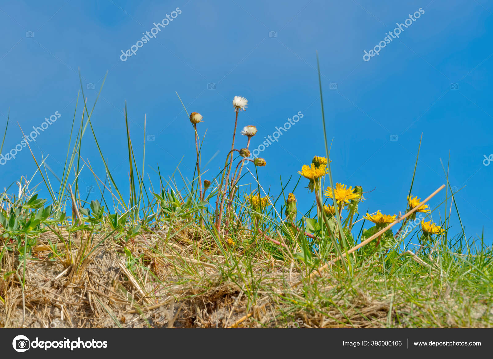 Rumput Dan Tanaman Dandelion Langit Biru Latar Belakang — Stok Foto © Kiwar #395080106