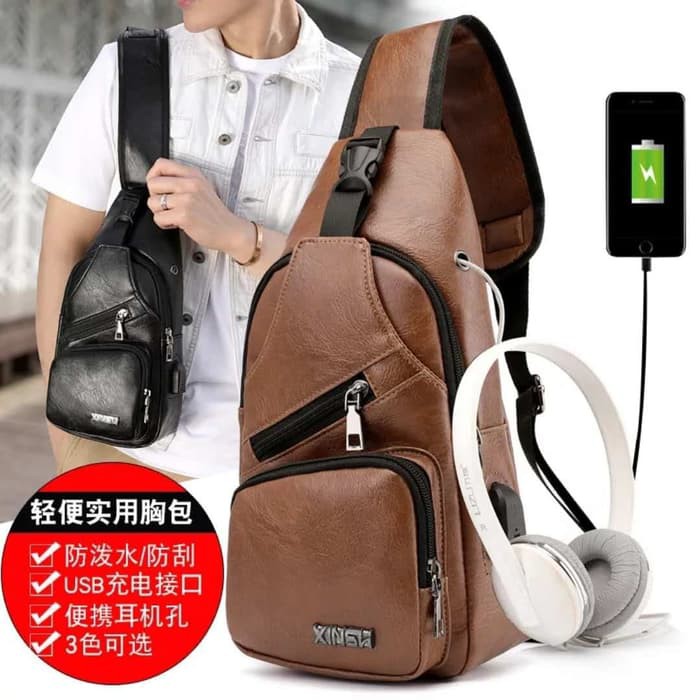 Tas Selempang Slempang Pria Tas Selempang Kulit With USB and Earphone Plug PU LEATHER IMPORT Tas