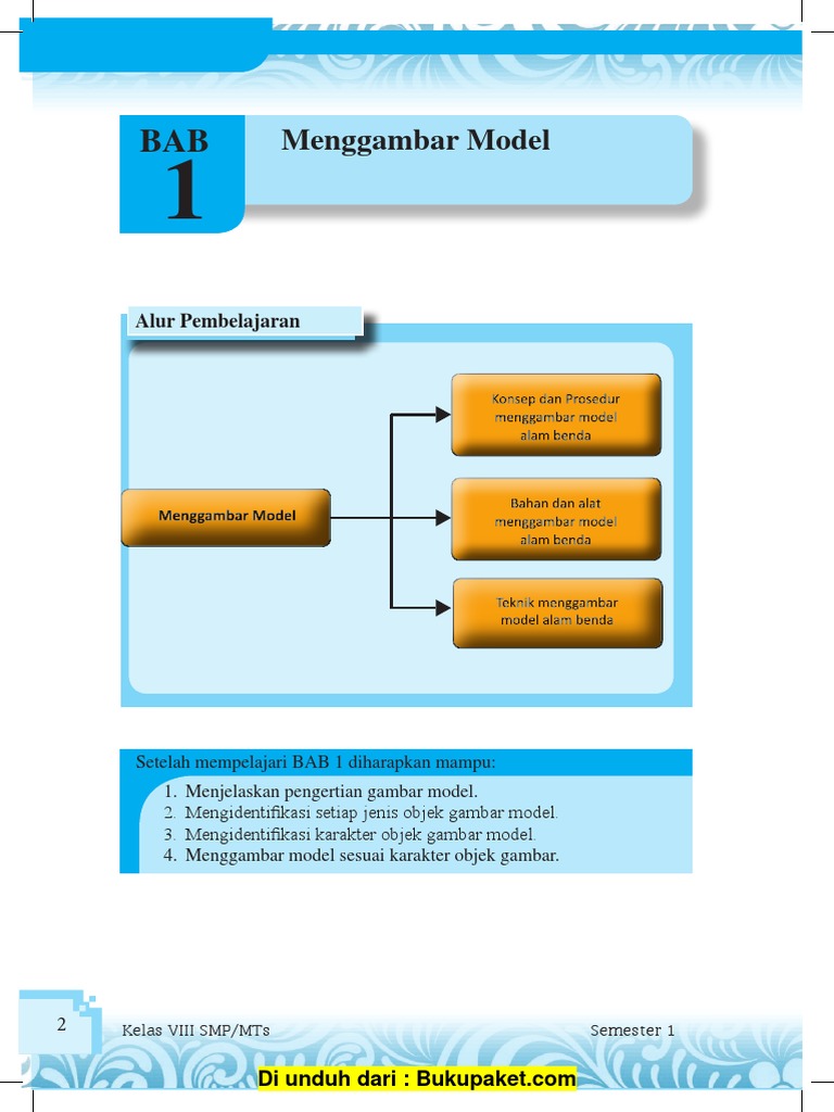1. Menjelaskan pengertian gambar model. 2. Mengidentifikasi setiap jenis objek gambar model. 3. Mengidentifikasi karakter objek gambar model. 4. Menggambar model sesuai karakter objek gambar. Setelah mempelajari Bab 1, siswa diharapkan mampu: - Bab 1 Meng