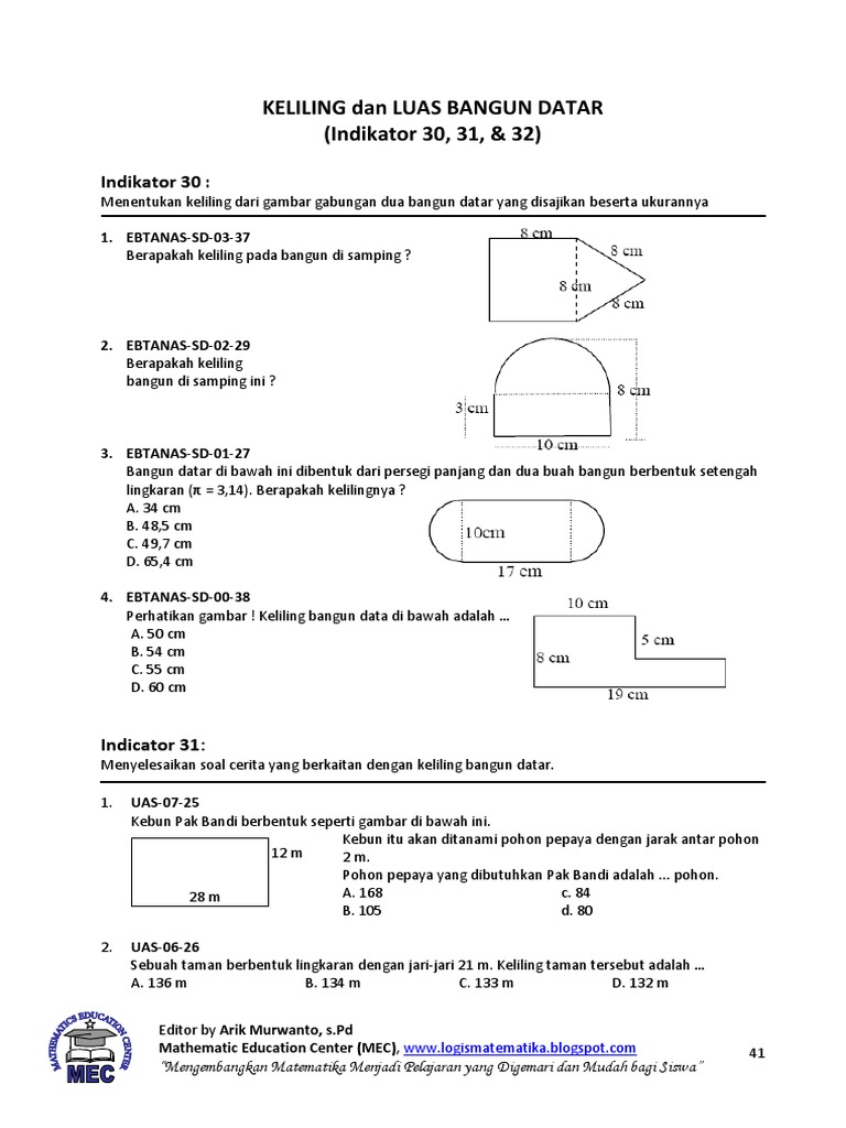 Luas dan Keliling Bangun Datar (1)_soal Kelas 6 SD. 1. Rumus luas persegi panjang adalah… A. B. C. + D. - PDF Free Download