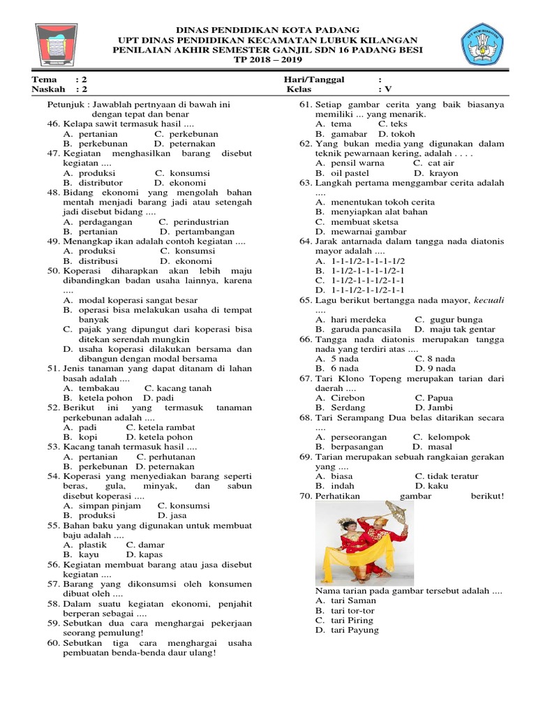 Dinas Pendidikan Kota Padang Upt Dinas Pendidikan Kecamatan Lubuk Kilangan Penilaian Akhir Semester Ganjil Sdn 16 Padang Besi TP 2018 – 2019 Tema: 2 Hari/Tanggal: Naskah: 2 Kelas: V