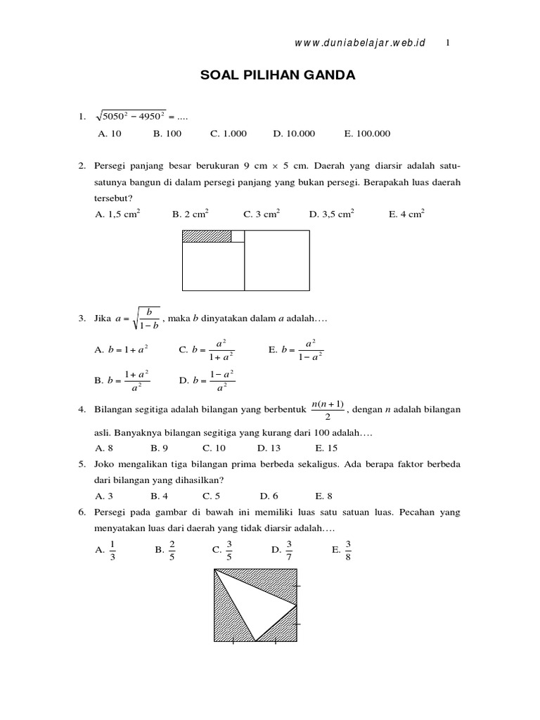 2 - .e. 100000 2. Persegi panjang besar berukuran 9cm x 5 cm. Daerah yang diarsir adalah satu-satunya - [PDF Document]