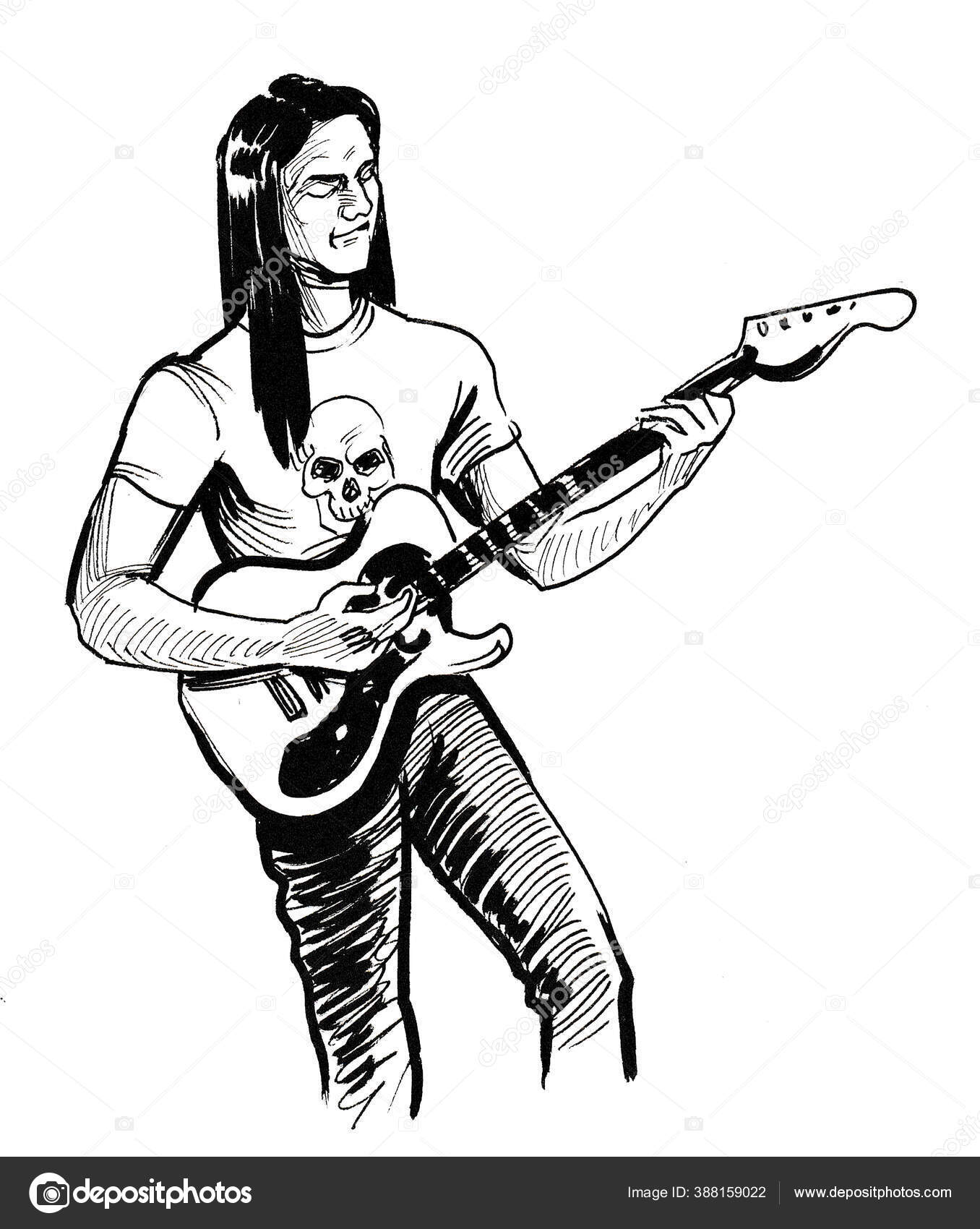 Musisi Rock Bintang Dengan Rambut Panjang Bermain Gitar Listrik Sketsa — Stok Foto © alexblacksea #388159022