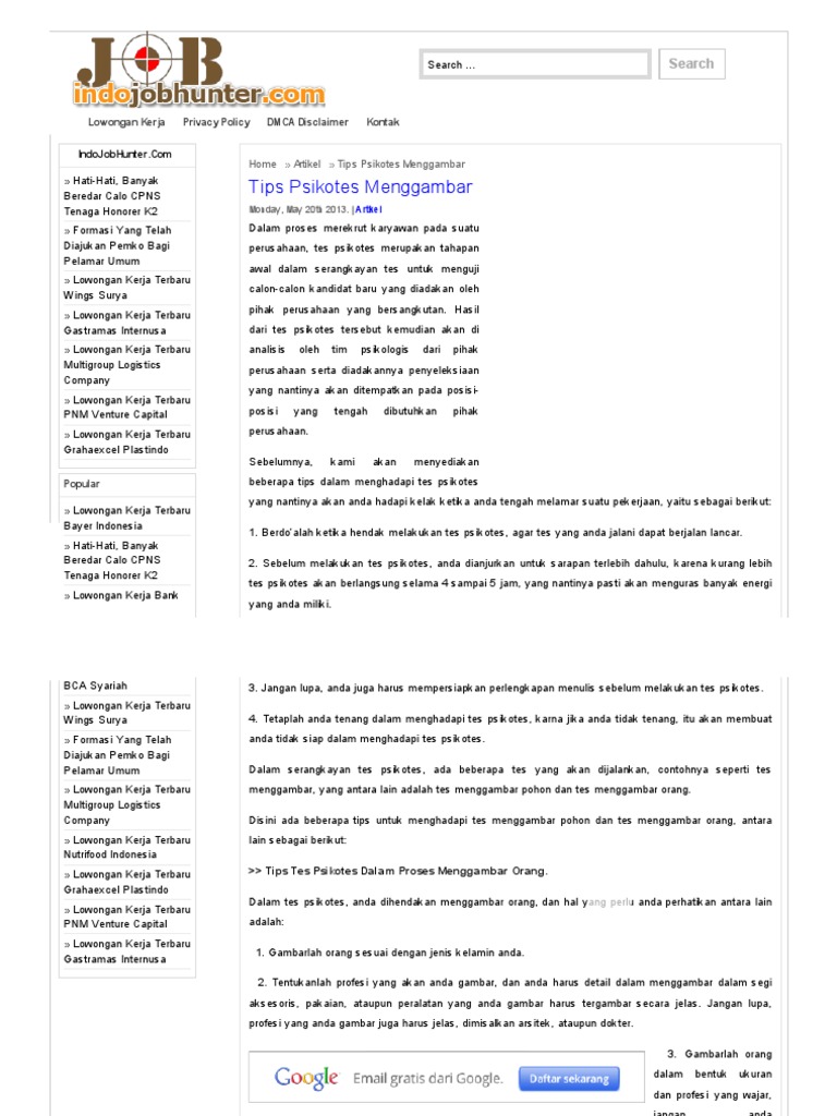 Mau Sukses Hadapi Tes Psikotes Menggambar? Ini Tipsnya Oleh Fitriana Monica Sari . Hampir seluruh perusahaan mewajibkan psikotes sebagai bagian dari tes masuk calon karyawan. Pada dasarnya, psikotest dilakukan untuk menguji apakah
