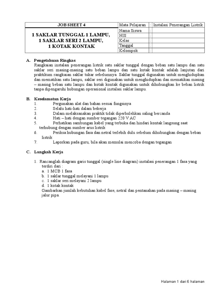 JOBSHEET PRAKTIKUM 2 WORKSHOP INSTALASI PENERANGAN pemasangan saklar tunggal : … penghubung antara peralatan listrik dan aliran listrik juga … Mencoba mengoprasikan sesuai dengan - [PDF Document]