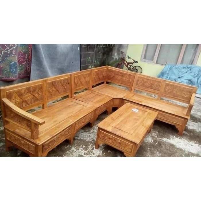kursi tamu sudut natural sofa minimalis meja teras tamu kayu jati ukir | Shopee Indonesia